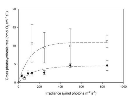 有趣的是,健康組織在暗適應RLCs的整個輻照度范圍內表現出略低的rETR值,褐帶組織也是如此,并且這反映在總光合作用輻照度曲線中。盡管RLCs的定量參數沒有顯著差異,但值得注意的是,不同技術手段均重現了這一趨勢。除健康組織熒光衍生的SSLC測量值外,未觀察到高輻照度下量子產率或O2產量的下降(圖5)。其他熒光衍生光曲線未出現顯著差異,表明觀察到的光抑制現象可能源于健康組織中PAR吸收率的降低,這可能導致更高的散射和光照暴露(圖3)。