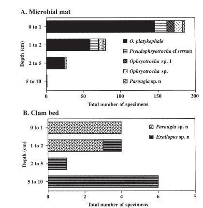 圖12. 對(A)微生物墊和(B)蛤床沉積物中所有取樣巖心匯總后,Dorvilleid物種分布的垂直分辨率圖。
